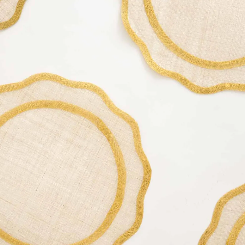 Our yellow edged scalloped round rice paper placemats will add just the right amount of elegance to your table. These chic placemats wipe clean with a damp cloth so they are practical for everyday use.
